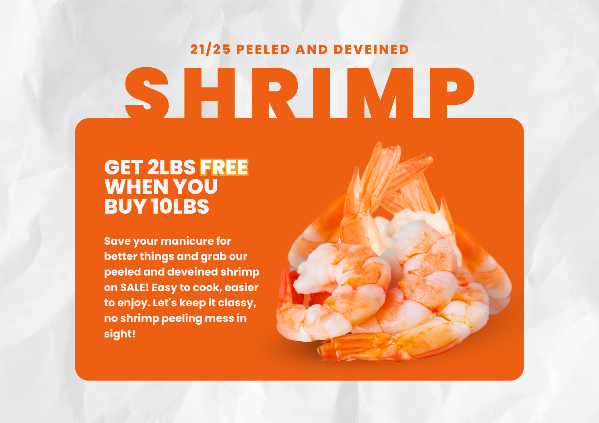 Save your manicure for better things and grab our peeled and deveined shrimp on SALE! Easy to cook, easier to enjoy. Let's keep it classy, no shrimp peeling mess in sight! Get 2lbs FREE when you buy 10lbs.
